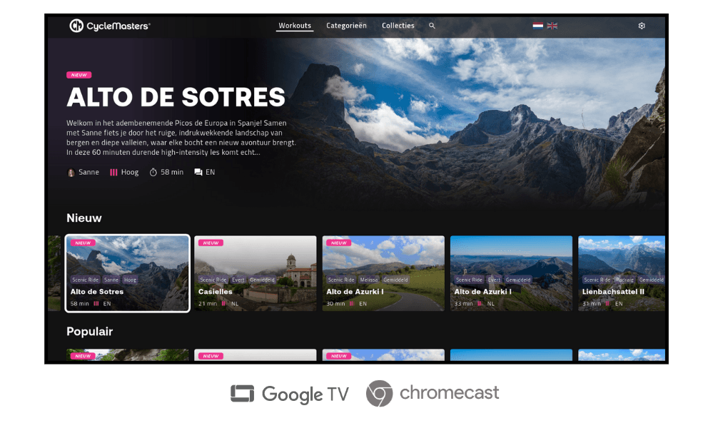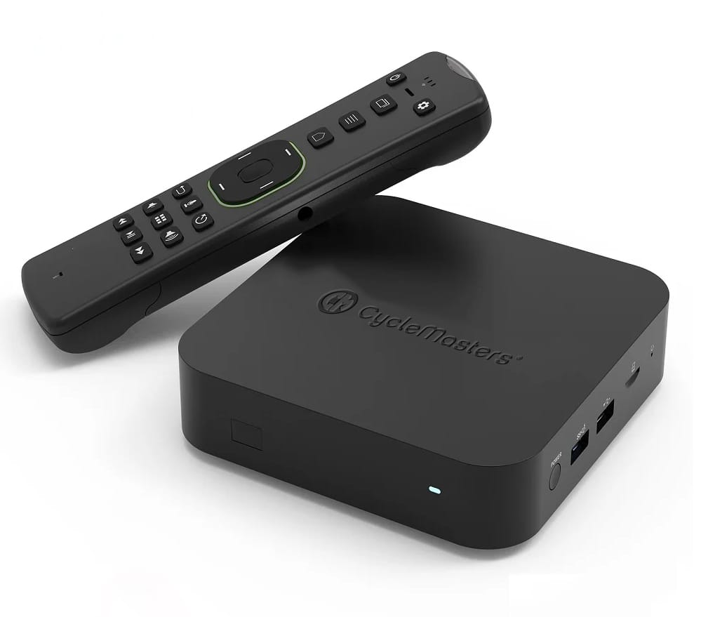 Onze eigen CycleMasters Studio Player is speciaal ontwikkeld voor zakelijke locaties en biedt de beste en meest stabiele afspeelervaring. Wil je liever je eigen hardware gebruiken, dan kun je de workouts ook afspelen op apparaten die draaien op Google TV (zoals compatibele smart-tv’s of Google TV-/Android TV-dongles).